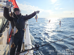 출항하여 포인트에 도착과 동시에 높은 너울과 바람으로 채비가 엉켜서 정신이 없었습니다ㅠㅠ시간이 지날수록 기상은 좋아졌지만 어군이 희미하고 빠르게 지나가서 수심을 맞춤과 동시에 사라지거나 생각보다 입질이 좋지 못하였습니다.깊은바다에 혼자떠서 낚시를 하였는데 마릿수는 안쪽보다 살짝 적지만 사이즈가 좋은게 잘나와주어서 계속 깊은 바다만 공략하였습니다!