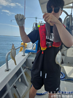 9분 모시고 참가자미 체험 낚시 2시간 다녀왔습니다. 얕은 수심을 돌아다니다 입질이 없어서 깊은 곳으로 가니 우다다 물어줍니다.가자미들이 깊은 수심으로 다 빠졌네요.아직 횟대가 안 물어서 낚시하기 좋았습니다.